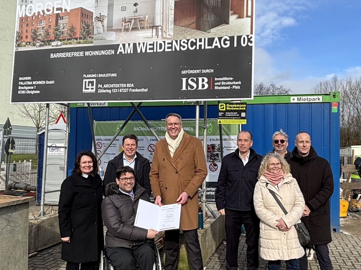 Das Land Rheinland-Pfalz fördert mit Unterstützung durch Mittel des Bundes den Neubau von 29 bezahlbaren Mietwohnungen in Ludwigshafen: Die Palatina Wohnen GmbH erhält hierfür Darlehen der Investitions- und Strukturbank Rheinland-Pfalz (ISB) in Höhe von rund 6,4 Millionen Euro und Tilgungszuschüsse in Höhe von rund 2,9 Millionen Euro. Ministerpräsident Alexander Schweitzer überreichte gemeinsam mit ISB-Vorstandsmitglied Dr. Ulrich Link den Förderbescheid an Sebastian Bäumler, Elisabeth Bäumler-Vivell und Frank Wolf, Investoren der Palatina Wohnen GmbH.